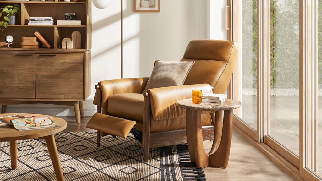 The Dean Leather Recliner Armchair from Castlery has a clear, structured build. The exposed wooden frame outlines the chair, while thick cushions sit neatly within it. It brings a sense of order to the space, especially when paired with other wood pieces nearby.